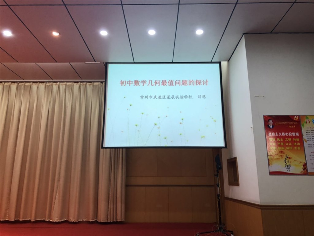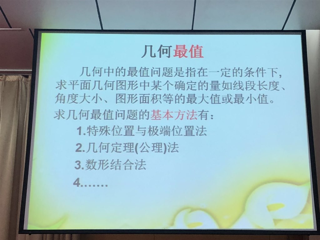 5日上午由星辰实验学校的刘慧主任作了《初中数学有关最值问题的研究与探讨》的报告,刘主任列举了一个系列的最值问题,并收集了相关的中考题与大家分享,她的细心与钻研精神让我佩服得五体投地!