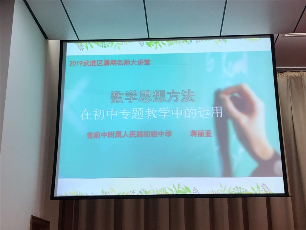 6日上午是由武进教研员于新华老师的讲座----《2019中考数学试题讲评》,这是所有数学老师都关心的问题,中考有三项功能:让老师了解学生的学习情况,评分的标准,今后的教学方向,对于中考压轴填空、选择、最后三个大题,于老师都作了解读,也谈了自己的一些观点和想法,比如极值有关的选择压轴题是一个好题,给我们的启示就是图像信息题在2020年中考要重视,在计算中要注意成比例巧算,当然中考卷也有美中不足之处,如果把最后一题前置的话,可能分数会高一些。