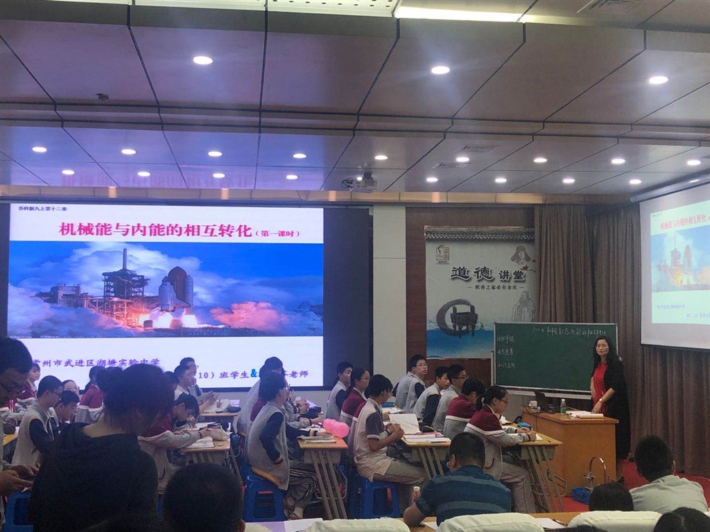 活动中,梅建芬副校长首先为全体老师展现了一节精彩纷呈的《机械能与内能的相互转换》示范课。梅校长由一段科学视频导入,极大地激发了学生的学习兴趣;接着让学生通过弯折铁丝和感受气球喷气两个活动来体验机械能和内能的相互转换;然后学生从老师展示的实验出发,思考其中的因果关系,深度感受了机械能和内能的转化原理;最后同学们在自主探究学习的基础上,结合汽油机模型观察思考解决了预习中的疑惑,并在课堂中进行知识的梳理和应用。