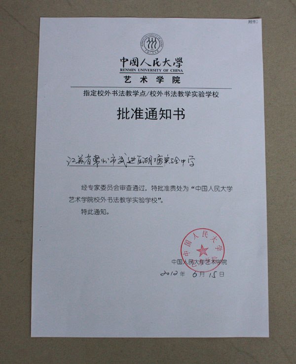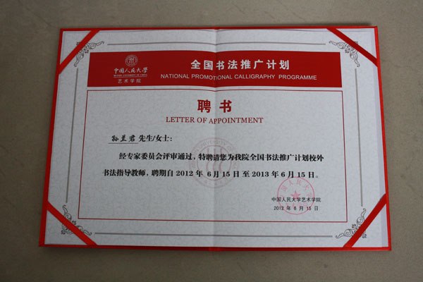 为弘扬书法艺术,推进民族艺术在“全球化”背景下的振兴与传播,由中国书法教育发展基金和中国人民大学艺术学院共同发起的“全国书法推广计划”现已全面启动。经过学校自荐、专家评审等一系列程序后,我校被中国人民大学授予为“中国人大校外书法教学实验学校”,我校孙兰君老师也当选为中国人民大学艺术学院全国书法推广计划校外书法指导老师。6月15日下午两点 ,中国人民大学艺术学院全国书法推广计划首批“校外书法教学实验学校”授牌仪式在京隆重举行。这将是我校书法教育史上的又一里程碑,它标志着我校学生今后将有资格参加中国人民大学艺术学院公共美术(书法)等级考试和奖学金评定,而我校孙兰君老师也能够参与中国人民大学艺术学院组织的各类书法课程的学习和各种学术研讨交流会,甚至担任“中国人大全国书法推广计划系列教材”的编委参与撰稿。