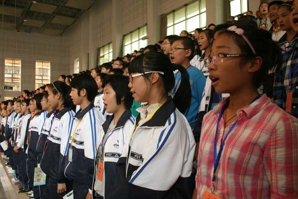 9月18日,是中华民族的“国耻日”,为了让学生牢记国耻,牢记当代青少年肩负的神圣使命,将来成为优秀的有时代责任感的社会栋梁。在活动一开始,初一年级部主任陈建伟老师向学生们讲述了“九﹒一八”事变的经过、“国耻日”的来历以及当前钓鱼岛形势。接着,体育馆内全场肃立,激昂的旋律响起,同学们高唱国歌,用这种方式表达一个当代青少年学生对历史的铭记和对未来的庄严承诺。