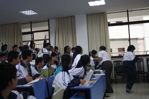 邱校长虽然是一名数学老师,但是这节课,无论是学生个人的自主学习还是小组合作探究,他都把握得非常到位。课后,邱校长针对自己的这节课也向所有老师进行了详细解读,并且与各位老师一起商讨如何具体操作才能让小组合作学习更活跃、更高效、更富成效。另外,针对教学案的编写,他认为对于不同的使用者应有不同的设计,要注意本班学生的特性。同时,他还指出,教学过程中一定要给学生足够的练习时间,“不动笔,不上课”,尤其是语文、英语等语言类课程,要引入朗读录音,让学生有一个更好的朗读示范,为其营造良好的语言氛围。这些,都是我们在今后的教学过程中应该注意的。