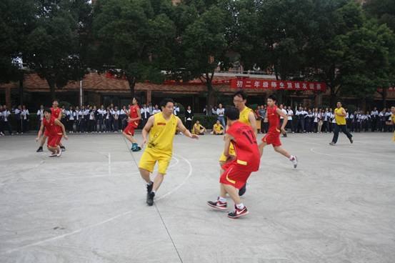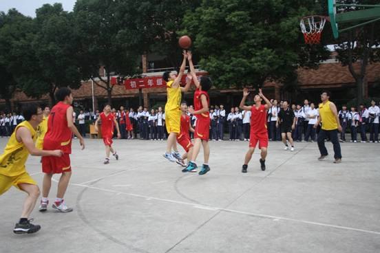 10月16日下午初二年级的活动课上迎来了一场别开生面的师生篮球比赛。由张伟俊、胡小凡、陆天一、李春林、冯平、许俊杰、潘亚波、李焕等老师组成的教师篮球队和以初二学生毛柯君、陈铭煊等为主力的校学生篮球队展开角逐。还未开场,整个球场被初二学生团团围住,助威声、呐喊声响彻全场。随着裁判员一声清脆的哨响,比赛拉开序幕。学生队配合默契,下底、传球、投篮一气呵成,漂亮的展示了他们的运动能力,率先夺得两分;教师队反攻,一个转身,一个飞跃,一个出其不意,球进了,李焕老师也为教工队夺得了2分!在你争我抢中,比赛高潮迭起,观众的掌声此起彼伏。抢断、盖帽、篮板、挡拆、传接、上篮等精彩动作不断上演,比分也不断的交替上升,张伟俊老师几个精彩的投篮连续得分,胡小凡老师临近节点一个漂亮的三分,潘亚波老师更是以强壮的身躯抵挡了几次强劲的进攻,教师队比分迅速超出,“稳住、稳住”,“控制速度”教师队员在互相鼓劲,学生队伍也不甘示弱。学生队场外教练徐乾大声叫喊“打内线,别急”,“把人挤出去”,“打配合”学生队员在不断的互相勉励,虽然学生队一度通过熟练的运球,精彩的传球,准确的投球,将比分一步步逼近,但最终教工队还是凭借其沉稳的防守以25:20取得了最终的胜利。