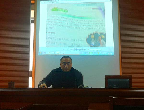 之后,陈建伟主任重点阐述了时事材料在思想品德课堂教学中的应用策略和体会。陈主任向成员们展示了自己一路探索的成果,从时事材料的搜集到课堂上的拓展再到开展初一年级社团活动等等。陈建伟老师以初一思想品德的第十二课和第十三课为例,重点阐述了如何在课堂教学中应用时事材料,和如何挖掘教材让课堂更生动更具魅力。最后陈主任强调青年教师要苦练基本功。