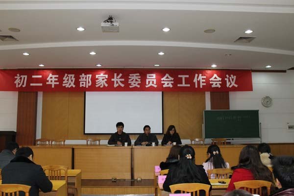 本次会议共分为两个议程,首先由年级部主任胡小凡老师代表年级部与各位家委会的成员进行交流沟通。胡主任代表学校、年级部对各位家长百忙之中亲临我校表示感谢。他强调家长的理解和支持是年级部各项工作得以顺利开展的重要保障。时代的变迁,让学校深刻的意识到每一位家长都是宝贵的教育资源,都是学校、班级的内在教育力量,具有着无穷的潜力。对于学校而言,家长委员会是一个十分重要的平台,是家长与学校和教师沟通的纽带和桥梁,同时也是学校教育的同盟者和参与者,彰显着强大的教育生命力。我校在如何发挥家长委员会的作用方面走出了一条探索之路,特色之路。我校初二年级部在每个班级成立了2-3人的班级家长委员会,确保家长由学校教育的“看客”主动转变成为学校教育的“当事人”,成为学校和谐发展的支持者、合作者、参与者。胡主任指出初二是学生成长发展的关键期,同时也是各种问题集中爆发的时期,更加需要我们老师和家长的密切关注,要关注他们的学习,关心他们的生活,捕捉他们的思想动态等等。胡主任希望家委会成员能更多的了解学校的办学理念、运转机制,以家长的视角,给学校多提宝贵意见和建议,帮助学校更好的营造良好的教育环境,为学生的成长、成人、成才创设良好条件,打造广阔天空。