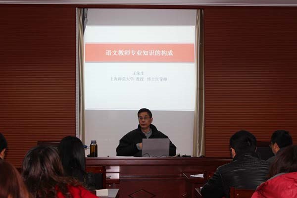 最后,王荣生教授向在座各位语文老师重点解读和部署了本学期的培训计划,并就“语文学科知识与教学能力”作专题讲座。王教授表示在本学期,他将带领团队深入我校语文三分课时制的教学,除了提供专题讲座之外,还将组织团队成员与全体语文教师共同备课,进行读书交流等活动。王教授指出语文教师的学科知识与教学能力呈正相关,语文老师需要重构科学的知识体系,需要审音用字,让学生在字正腔圆的诵读中学会由声悟情,循声求象。