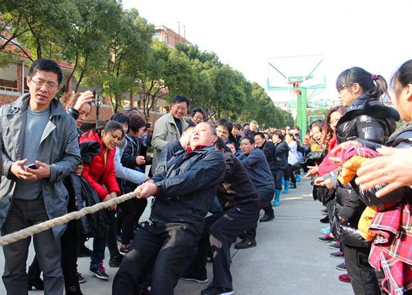 3月2日下午一点,伴随着活力动感的入场音乐,一个个身着休闲运动装的身影陆续出现在了学校操场。在体育组蔡兵老师的口令下,全体教职员工和所有后勤人员在顾志平校长的带领下开始了热身运动。首先是以学科组和后勤各部门为单位,集体绕田径场慢跑两圈,紧接着,由体育组王晓亮老师带领全体人员一起练习太极拳。热身活动结束,就进入到了本次健身活动的自由选项环节。今年的自由选项环节设有自行车慢骑、拉丁舞、五步拳、转呼啦圈、肺活量测试、羽毛球、花样跳绳、投飞镖、钓鱼、同心协力共十二个项目。大家热情高涨跃跃欲试,每个人脸上都洋溢着发自内心的欢笑,一时间,欢笑声、喝彩声、加油呐喊声充斥着整个校园。随后,全体人员稍作休息又立马开始了第二轮的集体项目——拔河。每组选手依次上场,各就各位,弓腿侧身。一声响亮的哨声骤然响起,选手们个个铆足了劲,涨红了脸,拉拉队们也不甘示弱,扯开喉咙拼命喊,张开手臂用力挥。每个人都沉浸在了比赛的欢乐中,小小的快乐,简单而幸福。