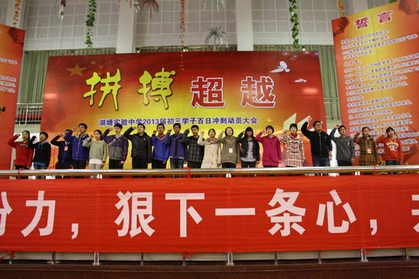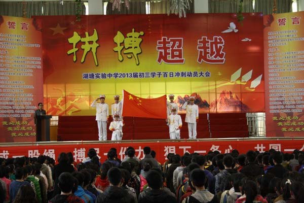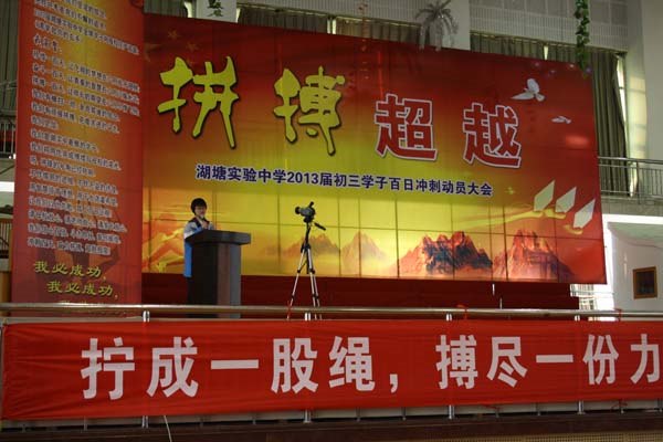 体育馆主席台主题板上 “拼搏 超越——湖塘实验中学2013届初三学子百日冲刺动员大会”的会标赫然醒目,主席台下的横幅“拧成一股绳,搏尽一份力,狠下一条心,同圆一个梦”则激起了全体师生冲刺中考的万丈豪情。