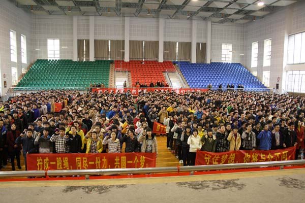 下午3点40分,初三年级全体师生齐集学校体育馆,举行2013届中考百日冲刺动员大会。朱文进老师主持了大会。在庄严的国歌声中,全体初三学生高唱国歌,向国旗行注目礼。