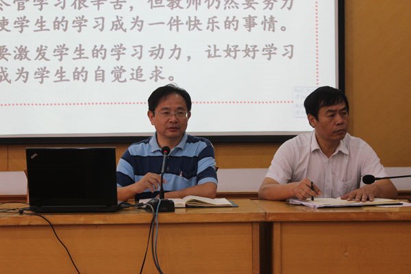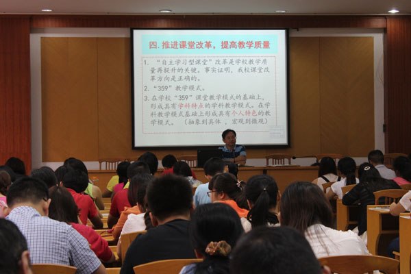 顾志平校长对新学期的教育教学工作做了动员讲话。他从会风切入,强调会风就是校风,会品就是人品,要求全体教师能够专注倾听,深刻思考,精确领悟,坚决落实,创造性的完成学校部署的各项工作。一个多小时的报告中,顾校长从“强化责任感,提升责任能力”、“强化团队精神,提升合作能力”、“推进课堂改革,提高教学质量”、“让学习成为学生的自觉追求”等四个方面做了深入细致的解读,深入浅出,旁征博引,既有对教师专业发展的指导,又有对教师人生征途的点拨。顾校长指出教书育人是教师的天职,老师们要能够科学选择教育方式,把平凡的教育教学工作转化为精彩快乐的事情,努力让学生感受知识的魅力,努力让学生体验成功的快乐,努力让学生认识到学习是一种责任。