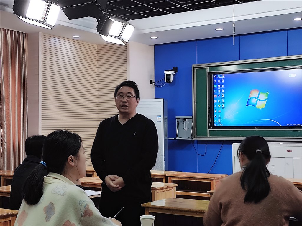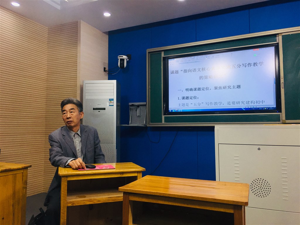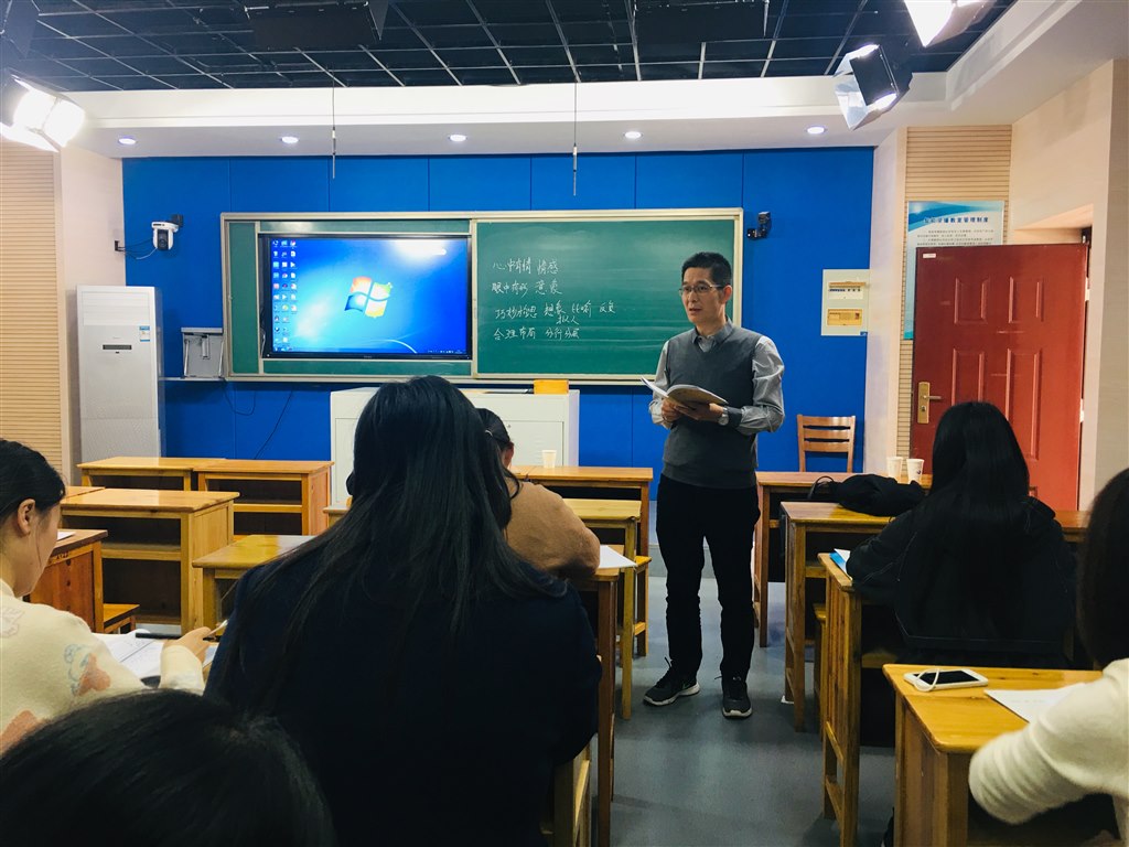 接着,张立成主任作了“现代诗歌教学三步走”专题讲座。张主任肯定顾榴英老师的诗歌写作教学的尝试,强调诗歌学习对学生的精神成长十分重要,不能忽视诗歌写作教学。他指出诗歌教学三步走的教学思路:读、诵、写,同时他明确这三者有先后,在教学中不可截然分开,要相互融合,互为因果,互为手段,互为方法,互为结果。张主任的精彩讲座启发了教师们的思维,对今后的诗歌教学有高屋建瓴的指导意义。