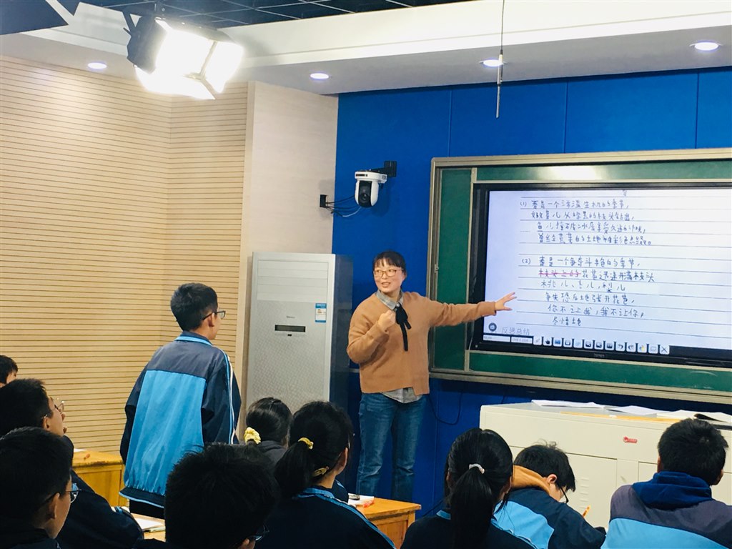 本次活动有四个环节。首先由工作室成员——洛阳初级中学的顾榴英老师开设了《尝试创作诗歌》研究课。顾老师引导学生诵读经典,感悟诗意;交流续写,概括写法;尝试创作,运用写法,完全点燃了学生写诗的热情。课堂呈现了分步教学的模式和分级目标的引导,给与会老师带来了深刻的思考和深远的启发。