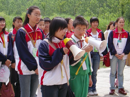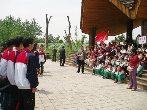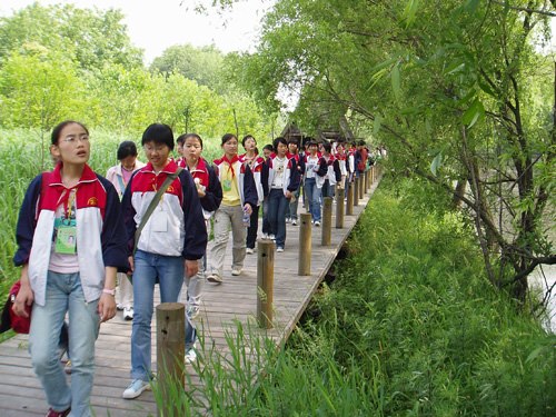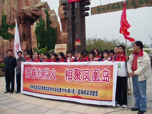 沿途游览了这些景观之后,小记者们就来到了凤凰岛生态旅游区,在旅游区大门口,千余名小记者参加了江苏省首块社会实践基地的挂牌仪式。我们湖塘实验中学也在这里挂了一块“社会实践基地”的铜牌,而我们小记者们拿的横幅“青春红似火,相聚凤凰岛”也吸引了在场所有的相机。我校的小记者还作为挂牌单位与扬州市委的领导、扬州日报的编辑和旅游区的负责人合影留念。