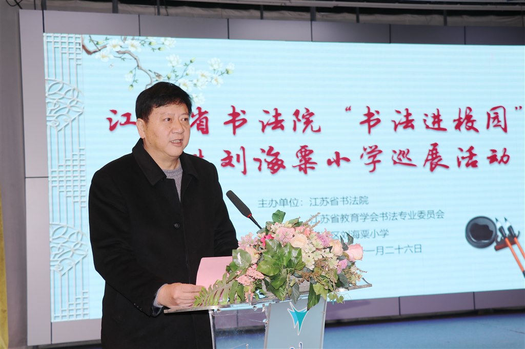 接着,江苏省教育学会书法专委会理事长陈钢寄语,他首先祝贺本次“书法进校园”活动成功举办,感谢主办、承办单位的精心筹备及教育同仁的积极参与。他指出,书法是中华优秀传统文化的核心载体,兼具审美、文化与育人价值,既能提升师生书写素养与审美情趣,更能厚植家国情怀。他高度肯定刘海粟小学在书法教育方面的成效,称赞其将书法融入教学与校园文化,为全省提供了宝贵经验。同时,他强调,省教育学会书法专委会将持续联动各方力量,开展多样书法进校园活动,助力提升书法教学质量,推动中华优秀传统文化在青少年中薪火相传。