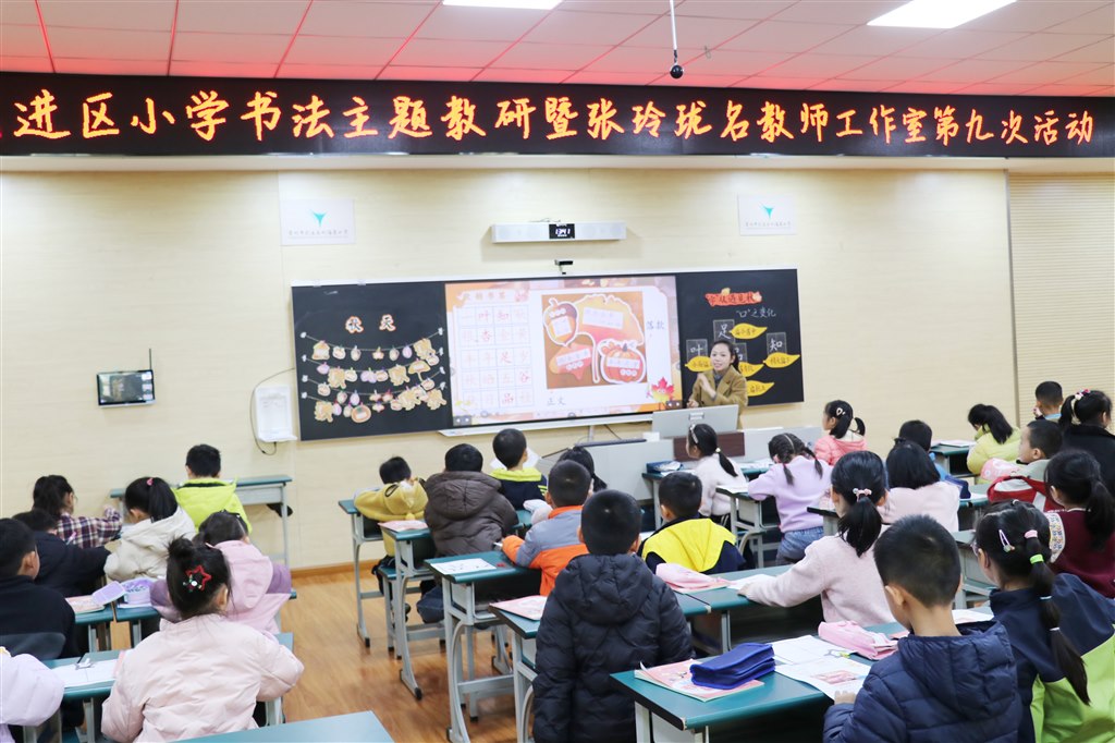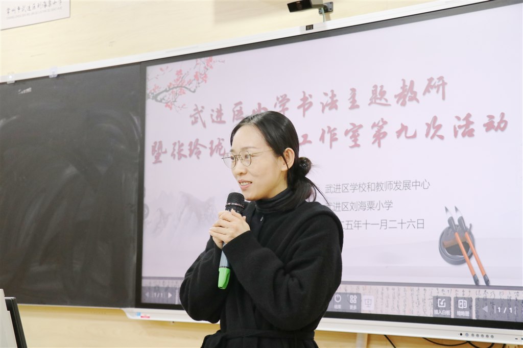 下午的活动聚焦书法教学实践,精彩纷呈。扬善楼二楼观摩教室内,两节高质量的书法研究课依次开展。刘海粟小学左菲老师执教一年级硬笔《秋天》,以季节为切入点,引导孩子们在笔画书写中感受汉字的韵律之美,课堂生动有趣、寓教于乐;武进区实验小学徐梦羽老师带来四年级软笔《禾木旁》,从偏旁结构解析到笔墨运用指导,层层递进、细致入微,让学生在练习中夯实书写基础,传递着中华“和”文化。武进区星辰实验学校李玲老师作《汉字文化与跨艺术审美双轮驱动——书法教学的融合路径与实践探索》主题分享,她围绕“构建完整美育路径”的核心价值,明确书法在审美培育中的基础定位;从“多元融合路径创新”展开策略探索,提出书法与文学、绘画等跨学科融合的教学思路;并通过“融合路径具体实施”的实践案例,展示如何将汉字文化内涵与艺术审美体验融入课堂环节。李玲老师的分享既立足理论高度,又贴合教学实际,为书法教学从“技艺传授”向“文化育人”进阶提供了可借鉴的操作方向,引发在场教师的深度共鸣。
